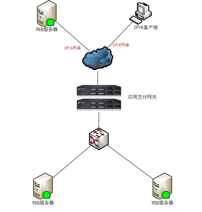 参见如下的网络逻辑示意图,应⽤交付控制器作为 IPv6 和 IPv4 的协议网关来部署,同时提供数据中心 Web 应用服务器集群的负载均衡等应用交付的功能。数据中心内部的应用程序还没有经过 IPv6 的改造,依然是 IPv4 的环境,应用交付控制器分别连接 IPv6 和 IPv4 两个网络,通过虚拟服务器方式将数据中心的 Web 应用发布在 IPv6 的网络中(图中以虚拟服务器vs_main: 2017:1::158:80 对 IPv6 的客户端发布),IPv6 网络中的客户端可以访问应用交付网关发布的 IPv6 的虚拟服务器,通过代理的方式将请求转发给数据中心内部的真实服务器,得到响应内容之后将返回的内容再转换成 IPv6 数据包返给客户端,从而保证客户端能够在⼀个 IPv6 的网络中访问数据中心 IPv4 的应用。